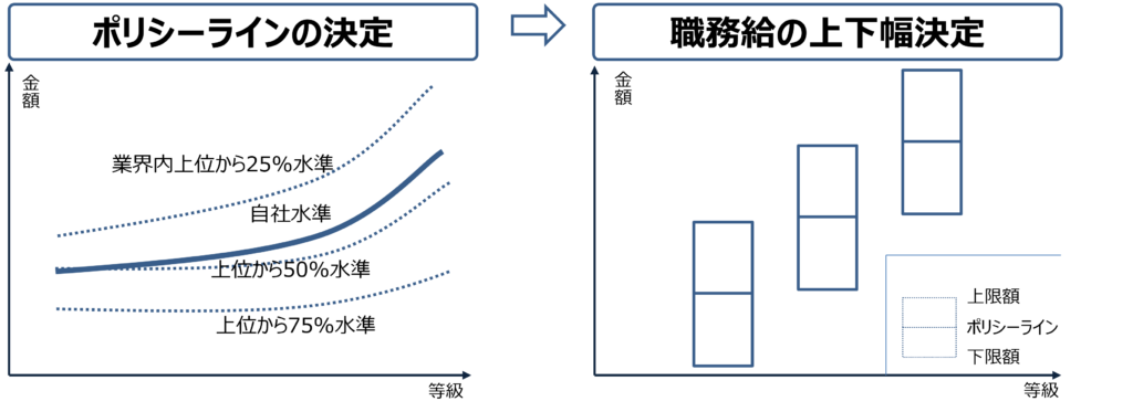 ポリシーラインとは、業界水準や競合との比較を踏まえ、自社がどの水準で職務給を設定するのかを示す基準線です。これは単なる目安ではなく、「この等級における妥当な処遇水準」を示す、会社からの明確なメッセージでもあります。