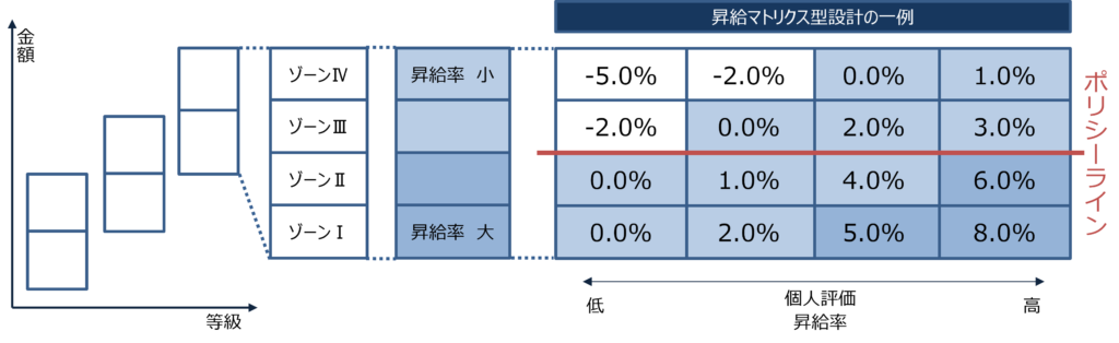 さらに、昇給のあるジョブ型を機能させるためには、同一等級内での昇給差をどのようにつけるかも重要です。そこで有効なのが、給与レンジを複数のゾーンに分け、ゾーンと個人評価を組み合わせて昇給率を決めるマトリクス型の設計です。