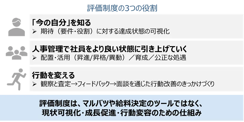 つまり、「評価結果=報酬決定」の構造は、評価制度の本来の3つの役割(現状可視化・成長促進・行動変容)を阻害してしまうのです。
