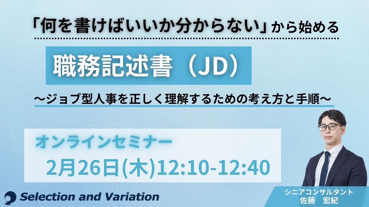 セミナー情報を公開しました 「「何を書けばいいか分からない」から始める職務記述書(JD)~ジョブ型人事を正しく理解するための考え方と手順~」【 2月26日(木)12:10〜12:40】
