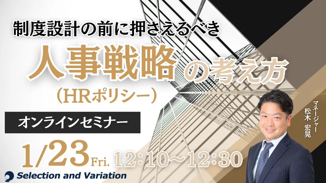人事制度の見直しや人材育成に取り組む企業が増える一方で、「制度はあるが運用されない」「評価や育成が場当たり的になる」といった課題も多く見られます。その背景には、事業戦略と人事施策をつなぐ“人事戦略(HRポリシー)”が曖昧なまま制度設計が進められていることがあります。本セミナーでは、HRポリシーの基本的な考え方と役割を整理したうえで、経営・事業の方向性を人材マネジメントにどう落とし込むかを解説します。制度改定や人材施策を「点」ではなく「線」でつなげるための視点を、30分でコンパクトにお伝えします