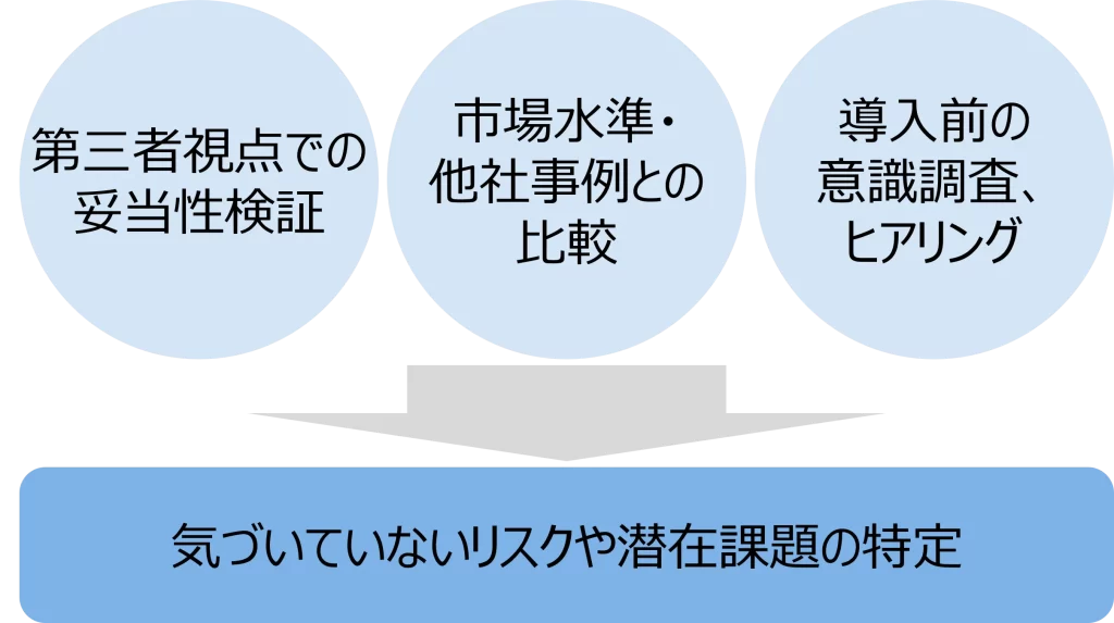 ・社員アンケート・ヒアリング調査:制度に対する社員の意識や不安点を直接収集し、運用段階でのリスクを特定します。